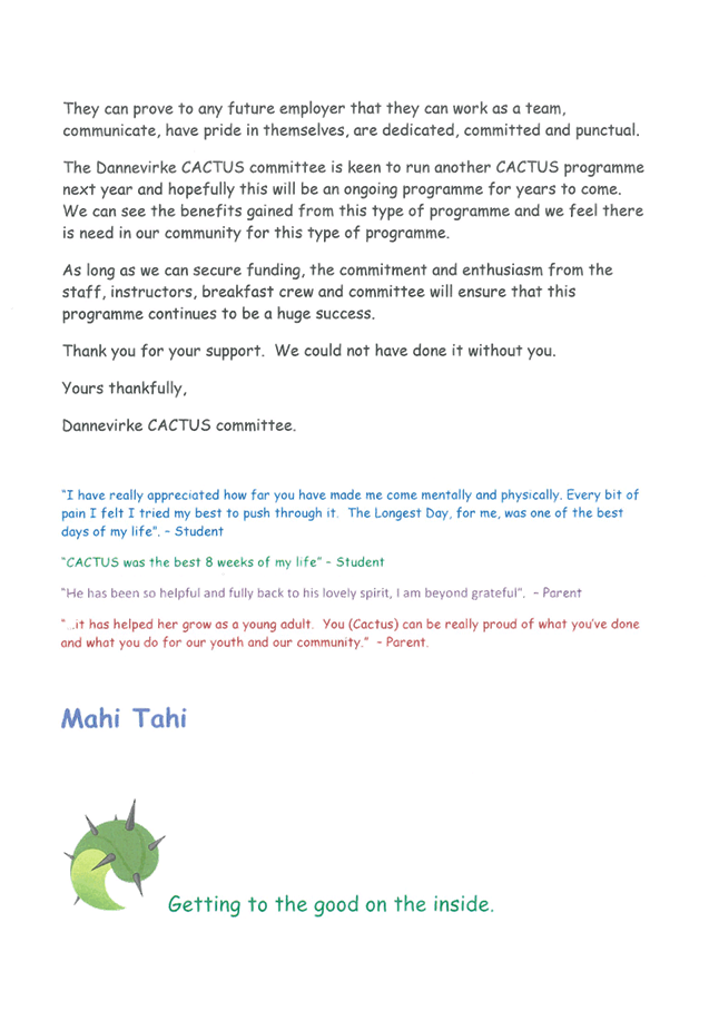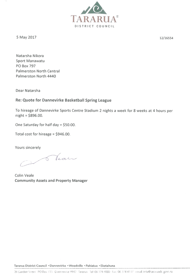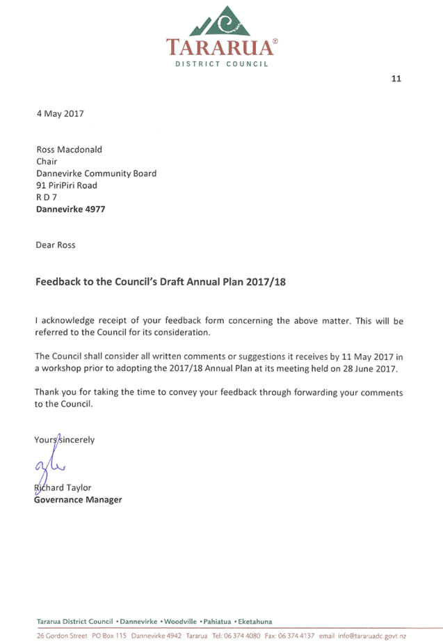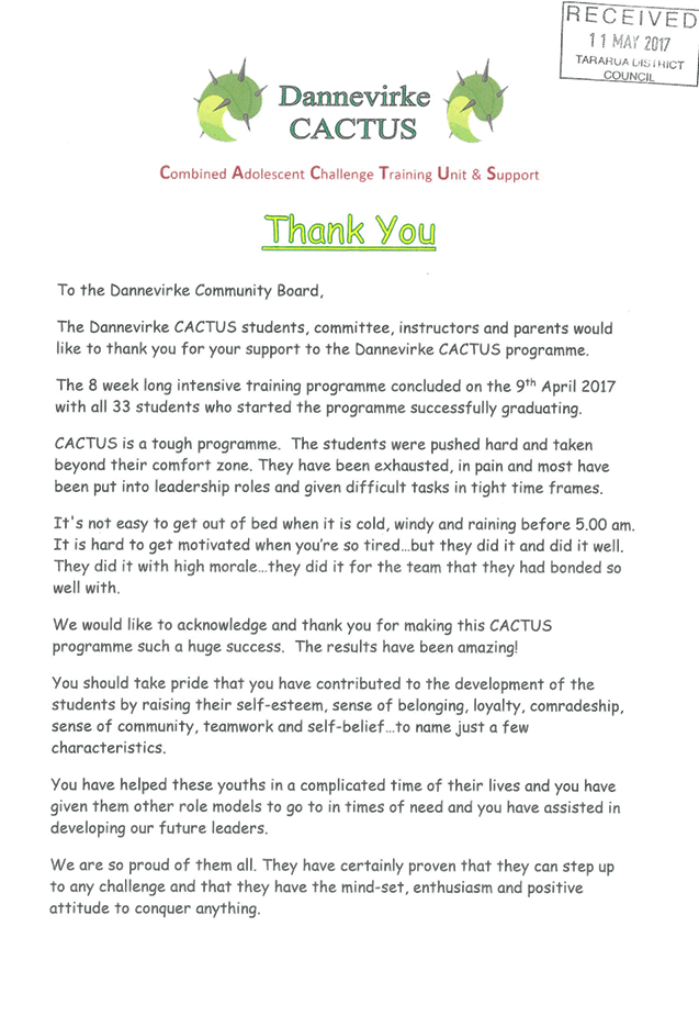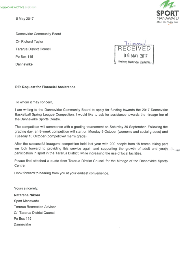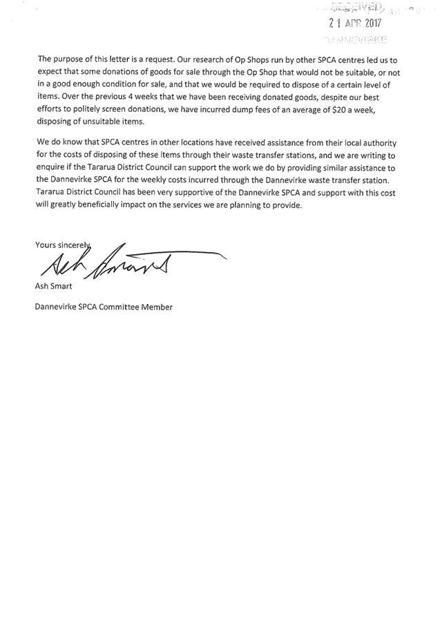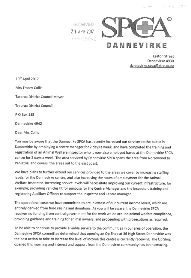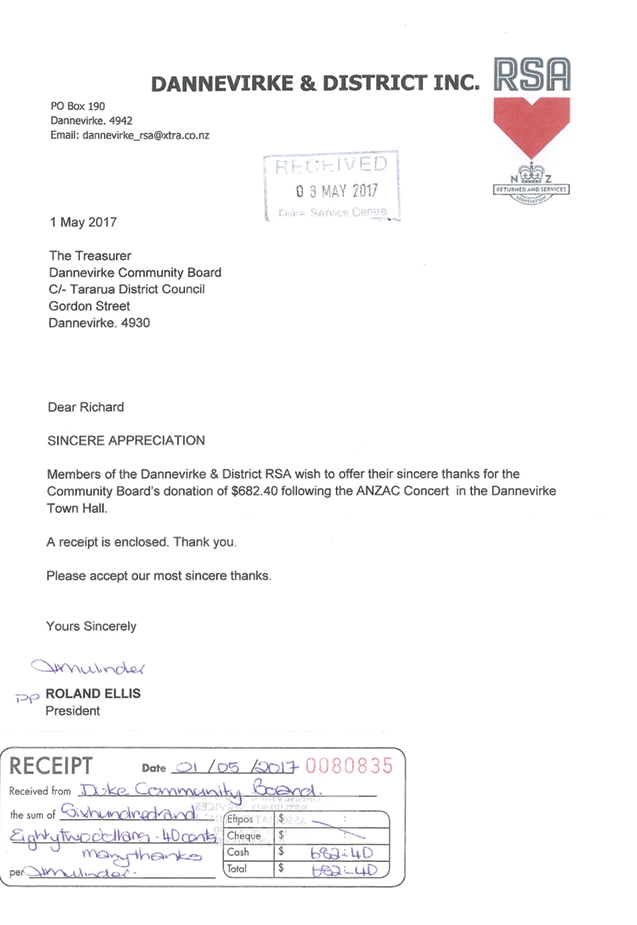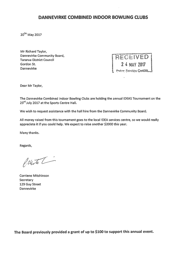 Recommendation That the correspondence as listed be received. (a) Dannevirke and District Returned and Services Association 1 May 2017 Re: Thanks for donation of admission charges from Anzac Day community concert (b) Tararua District Council 4 May 2017 Re: Acknowledgement of feedback to Draft Annual Plan 2017/18 (c) Dannevirke CACTUS Programme Re: Thanks for providing financial assistance (d) Dannevirke SPCA 19 April 2017 Re: Request for assistance with Op Shop transfer station charges to dispose of waste items (e) Sport Manawatu Tararua Recreation Advisor 5 May 2017 Re: Request for financial assistance to support 2017 Dannevirke basketball spring league competition (f) Dannevirke Combined Indoor Bowling Clubs 20 May 2017 Re: Request for financial assistance to support IDEA Services indoor bowling tournament |