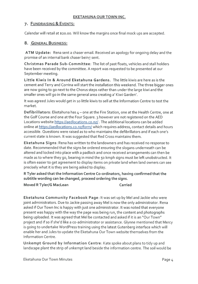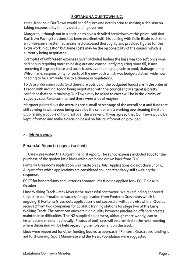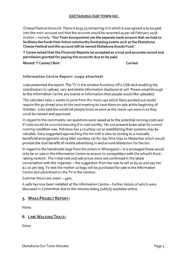 (b) Eketahuna Our Town Incorporated Re: 9 August 2018 Committee meeting minutes