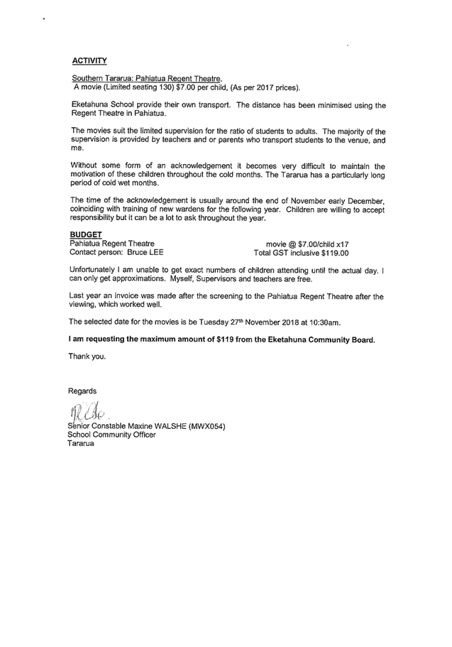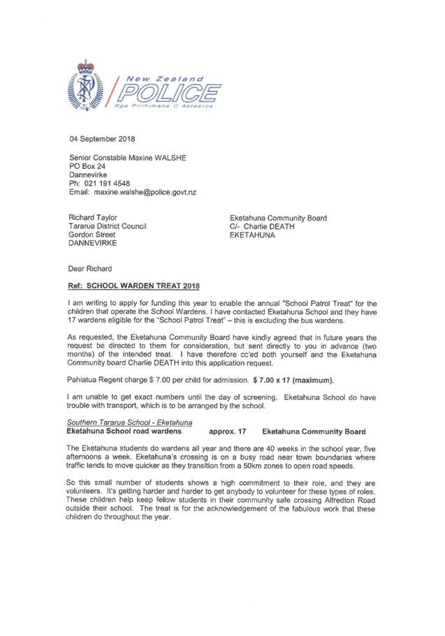 (c) Senior Constable Maxine Walshe Tararua School Community Officer 4 September 2018 Re: Request for funding to provide the annual school warden treat |